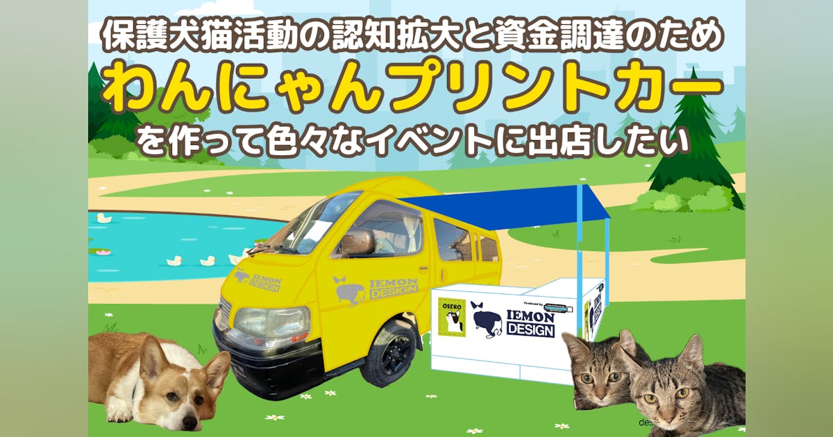 保護犬・保護猫活動を知ってもらい、さらに保護活動費を獲得するために、ペットイベントやわんちゃんねこちゃんが集まるところで犬・猫のプリントグッズを出張製造販売できる「わんにゃんプリントカー」を作りたい