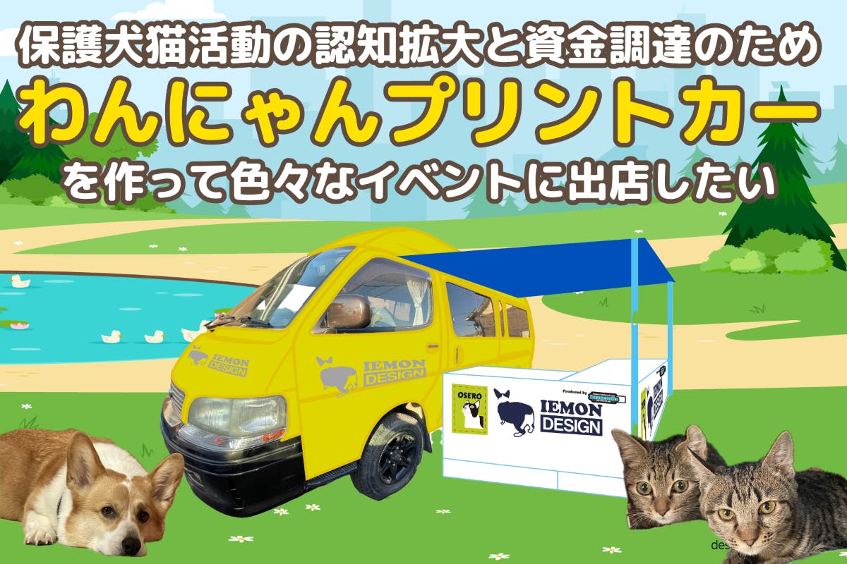保護犬・保護猫活動を知ってもらい、さらに保護活動費を獲得するために、ペットイベントやわんちゃんねこちゃんが集まるところで犬・猫のプリントグッズを出張製造販売できる「わんにゃんプリントカー」を作りたい